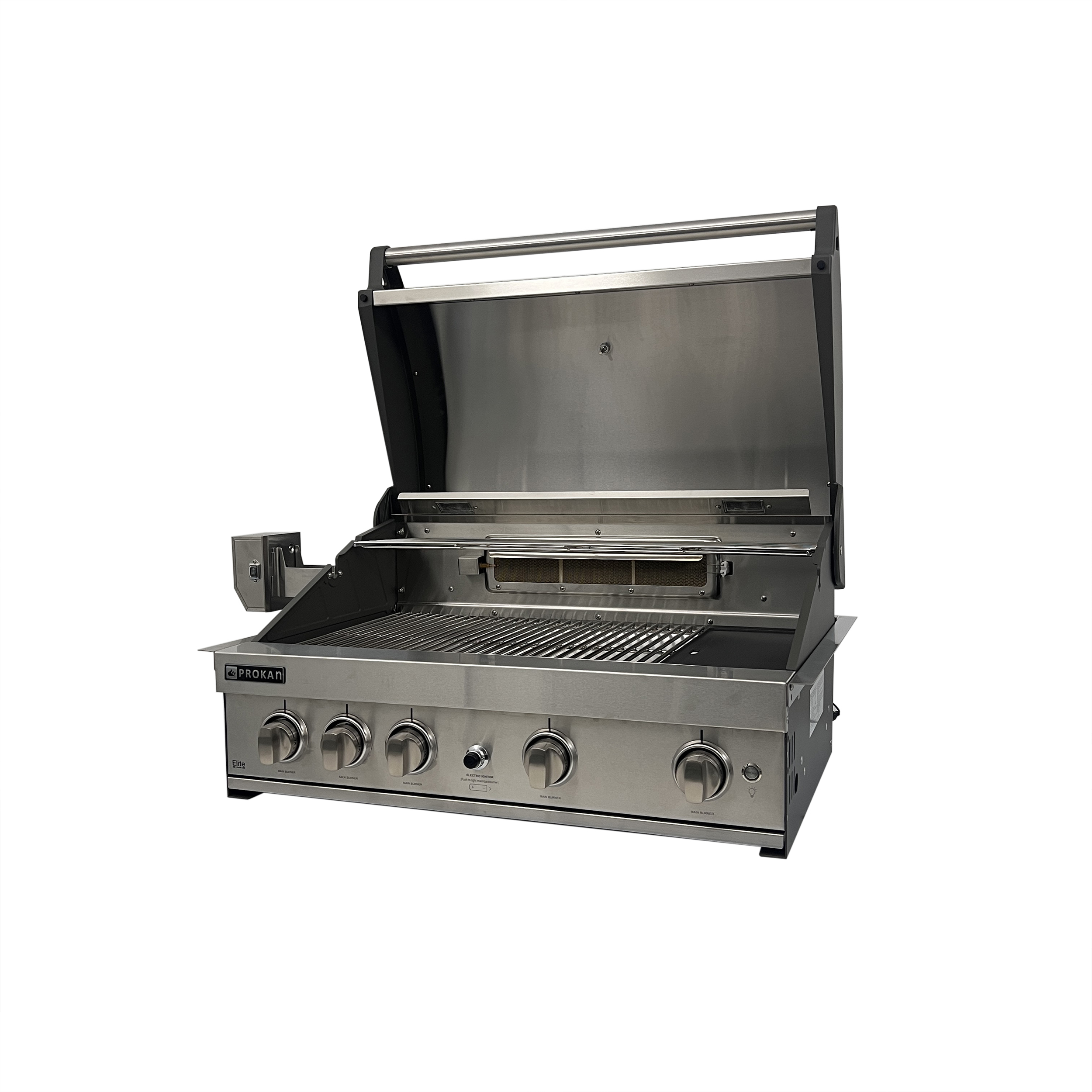 The GT Elite grill is a 32” 5-Burner stainless steel built-in gas barbecue grill with an Infrared back burner. The four premium stainless steel burners and rotisserie kit provide evenly distributed heat, minimizing hot and cold spots. A heavy duty temperature gauge measures internal cooking temperatures, so your entrée is grilled to perfection. With a stainless steel grease tray and front pull-out easy-to-clean drip tray, cleaning up after a meal is a snap.