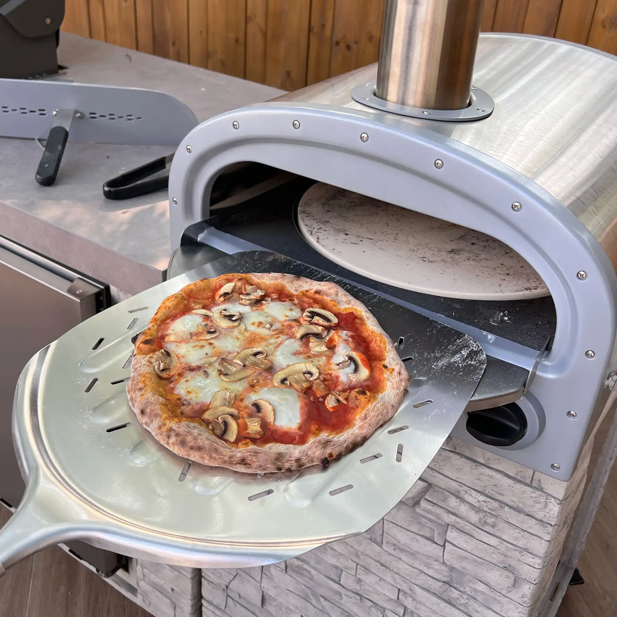 The oven features a temperature range from 356 °F to 896 °F, a touchscreen interface, and digital temperature control, meat probe, rotated pizza stone, ensuring reliable performance. This 4-in-1 grill and oven unit elevates outdoor cooking, making backyard entertaining effortless and enjoyable.