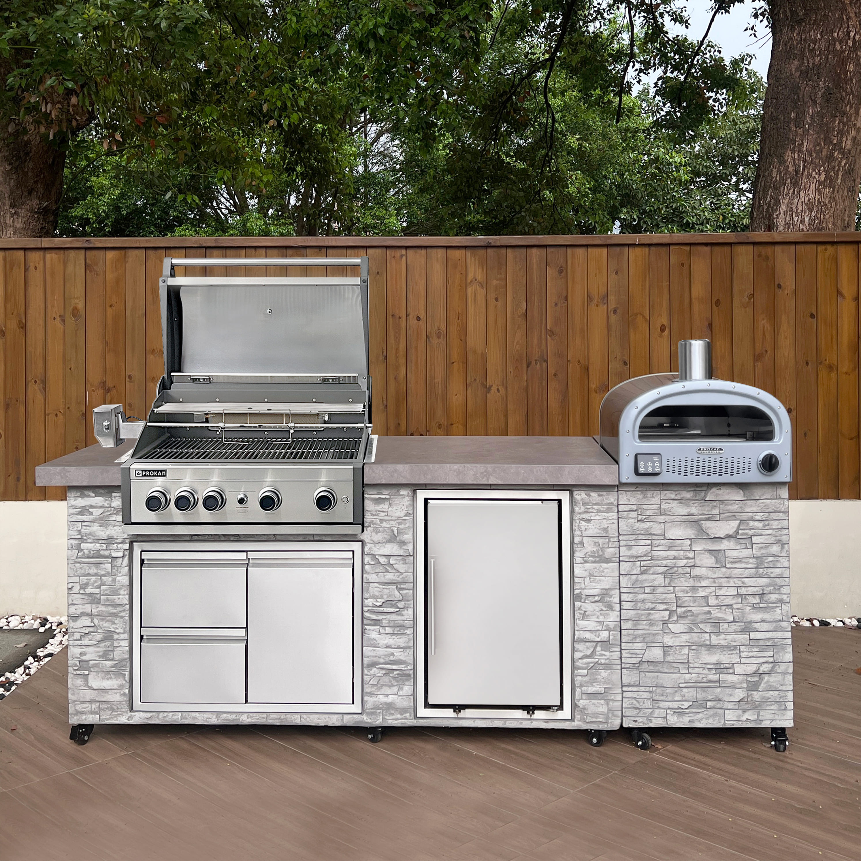 The Prokan 96″ European Ledge 5B Island Grill W/ Fridge and Outdoor Oven combines powerful grilling and precise baking in one stylish unit. With four 304 Stainless Steel burners, an infrared rear burner, a 52,000 BTU output, a slab stone countertop for prep space, and a built-in 63L fridge, this island offers convenience and efficiency.